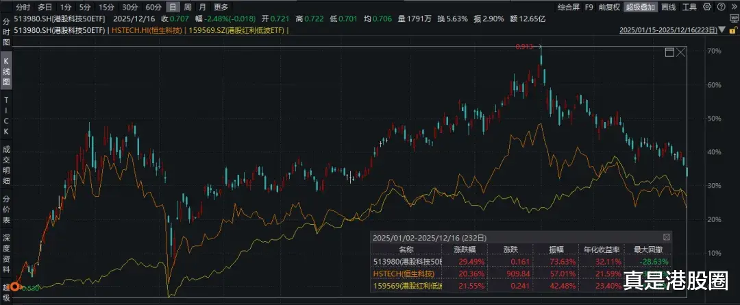 而港股红利低波ETF(159569)跟踪的是国证港股通红利低波动指数,也是市场上唯一一只跟踪该指数的基金,截至12.12,指数今年以来回报为21.5%,还强于恒生科技指数20%的回报。