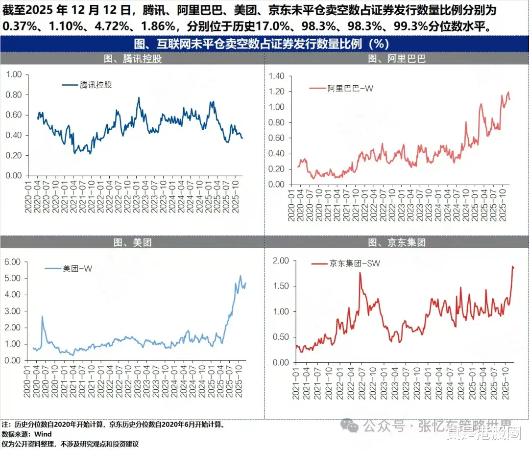最后,从下图中看。截止12月12日,腾讯、阿里、美团、京东未平仓的卖空股数位于历史上极端的位置。