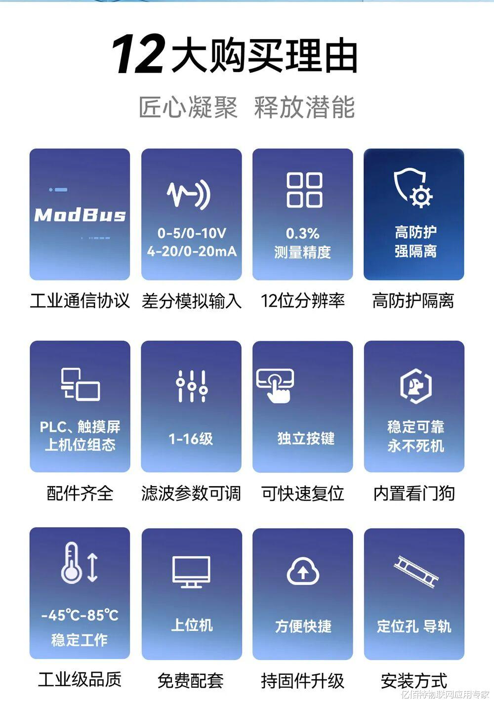 高精度采集,响应更迅速测量精度高达 3‰,分辨率 16 位,支持电压(0-5V/0-10V)与电流(0-20mA/4-20mA)信号。
