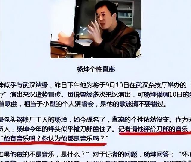先发声的,是经历与刀郎十分相似,同样都是草根成长起来的歌手杨坤,在记者的追问下,杨坤反问道:“他有音乐吗?你认为他那是音乐吗?”
