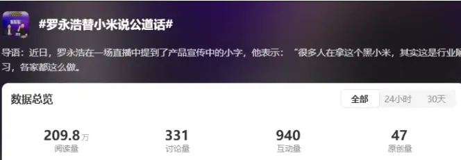 针对这一陋习,过去的2025年,小米被骂成了筛子!负面舆论最严重的时候,就连科技圈纪检委罗永浩也看不下去发表相关评论——罗永浩替小米说公道话:海报小字是行业陋习,很多人只黑小米……