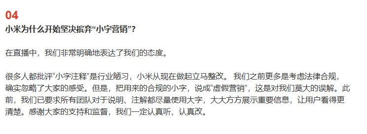 雷军也是多次下场亲自回应,“小字标注确实是行业中长期存在的问题,相关批评是合理的,小米接受意见并将作出调整。