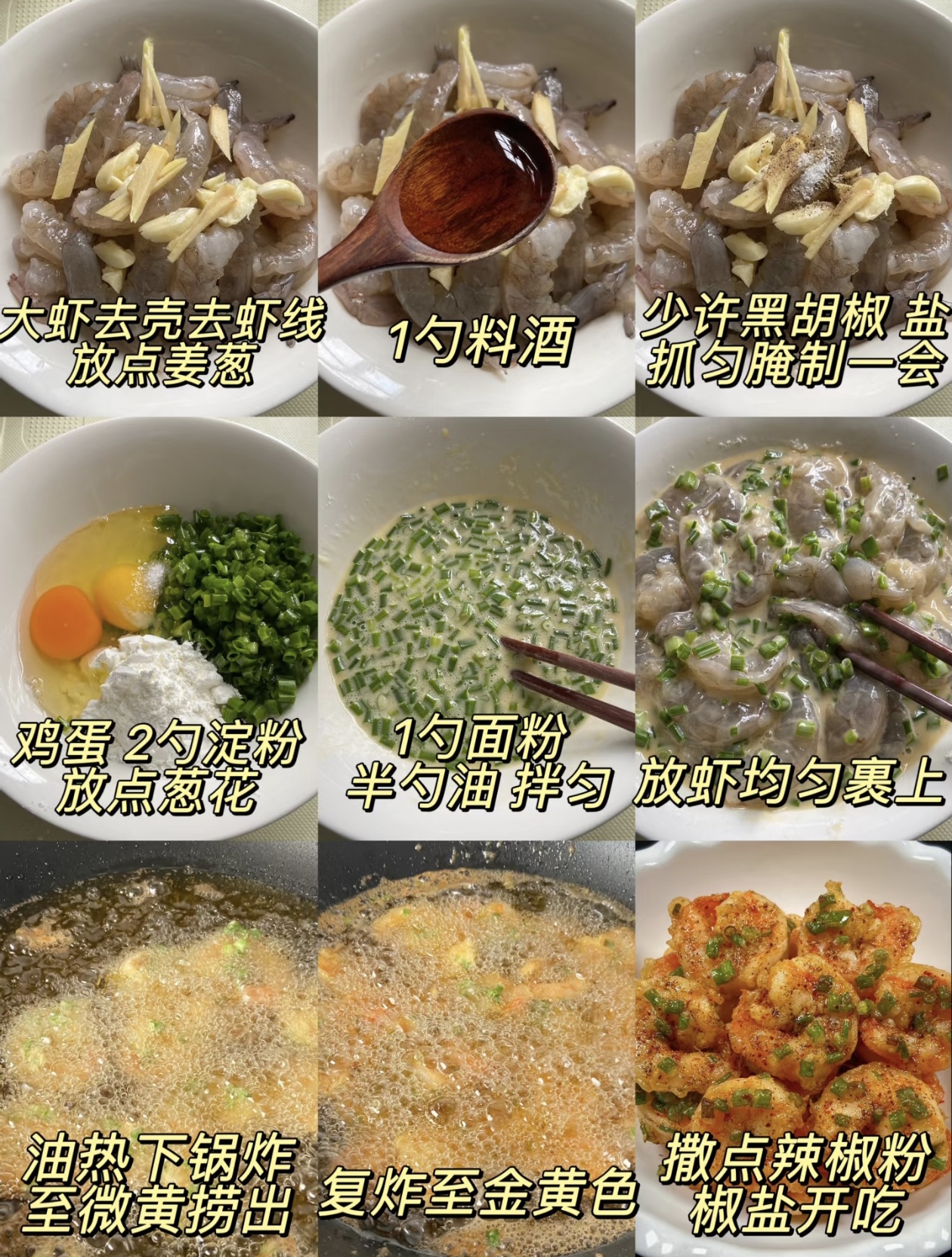先准备食材:新鲜大虾、鸡蛋、淀粉、面粉、葱花、姜蒜、料酒、黑胡椒、盐、辣椒粉、椒盐。处理虾是关键,先把大虾去壳去虾线,用清水冲洗干净,沥干水分后放进大碗里,再切几片姜和拍碎的蒜放进去,倒上一勺料酒,撒上少许黑胡椒和盐,抓匀腌制10分钟,既能去腥又能让虾肉更入味。