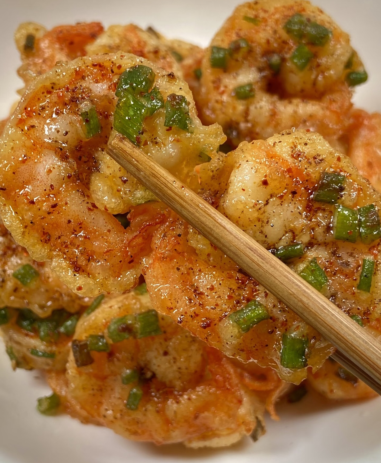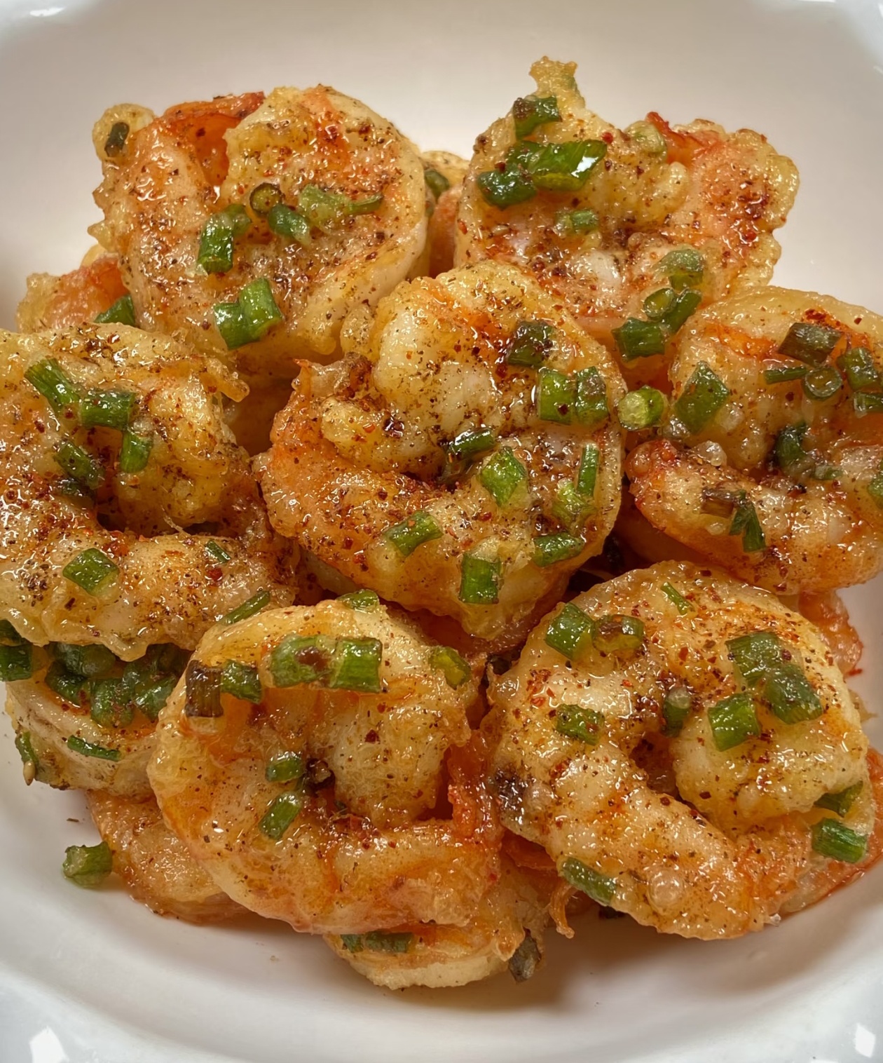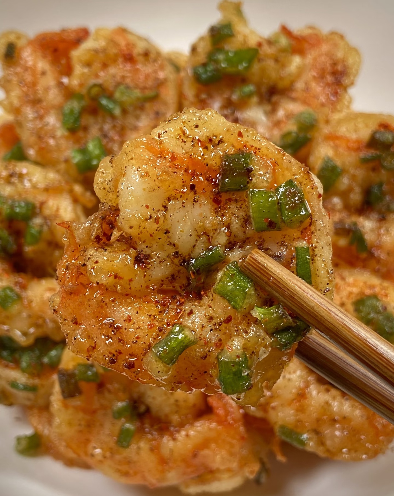 最后一步,把炸好的虾球装进盘子里,撒上适量的辣椒粉和椒盐,再撒上一把新鲜的葱花提香,用筷子翻拌均匀,让每一只虾球都裹上调料。刚出锅的虾球,金黄的外壳泛着油亮的光泽,葱花的香气混着椒盐的咸香,一口咬下去,咔嚓一声,酥脆的外壳在嘴里爆开,里面的虾肉紧实Q弹,鲜嫩多汁,葱香浓郁,越嚼越香,配米饭能炫三碗,追剧的时候当小零食也超合适。
