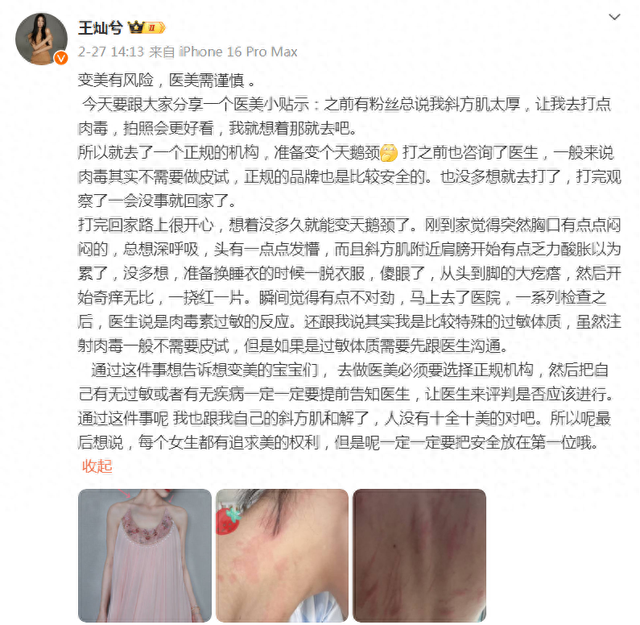 王灿此前因粉丝多次评论“斜方肌过厚”,选择前往正规机构注射肉毒杆菌,希望通过医美改善体态。但注射前未主动告知医生自身是过敏体质,且未进行皮试(常规操作中肉毒素注射通常无需皮试),导致药物引发全身过敏反应。 注射后数小时内,王灿出现胸闷、头晕、皮肤瘙痒等症状,随后全身遍布红疹,背部抓痕触目惊心。紧急就医后被诊断为肉毒素过敏, 医生指出 其体质特殊需提前沟通,否则可能危及呼吸系统。