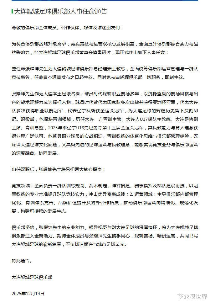 大连鲲城老板是真急了! 12月14日,大连鲲城官方发布公告,是一则人事任命通知,经俱乐部董事会慎重研讨,正式作出如下人事任命: 兹任命张耀坤先生为大连鲲城足球俱乐部总经理兼主教练,全面统筹俱乐部运营管理与一线队竞技事务。同时免去曲晓辉俱乐部一切职务,即刻生效。