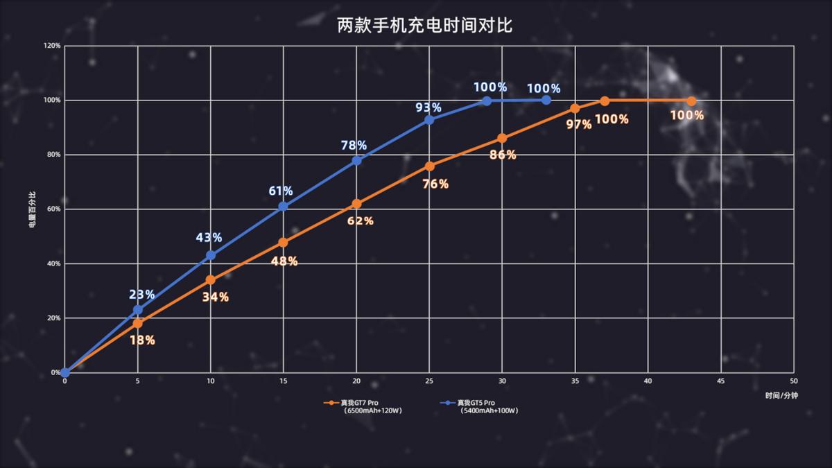 二者对比的话,真我GT7 Pro整体上更慢,在第5分钟慢了5%,第10分钟慢了9%,之后差距进一步拉大,在第20分钟的时候慢了16%,真我GT5 Pro在第29分钟充满,4分钟后断充,真我GT7 Pro继续持续了14分钟后断充。不过对比真我GT6的话,二者差距不是很大,在完全充满的时间上只有1分钟的间隔。
