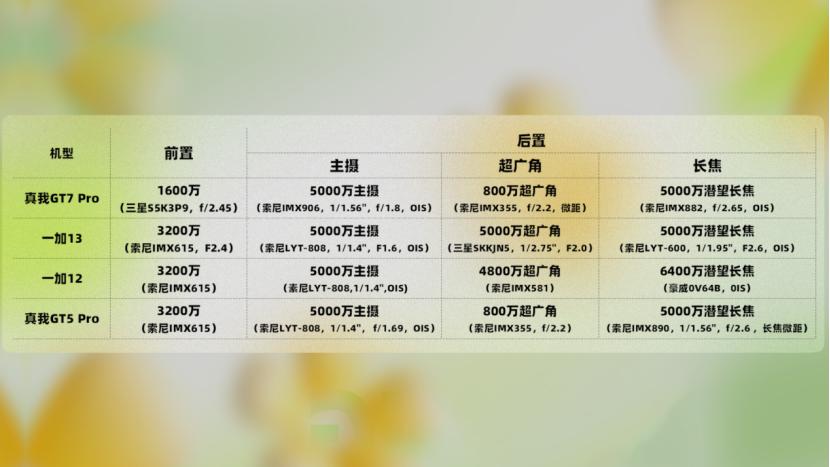 在影像搭配上,同样是主摄+超广角+长焦的组合。一加13、一加12以及GT5 Pro的主摄用的都是LYT-808(IMX966),而GT7 Pro换成了IMX906(LYT700),其实这两颗传感器都挺不错,实际成像质量上也没有很大的差异。潜望长焦换成了IMX882(LYT600),黑厂系有很多款机器都用的它。
