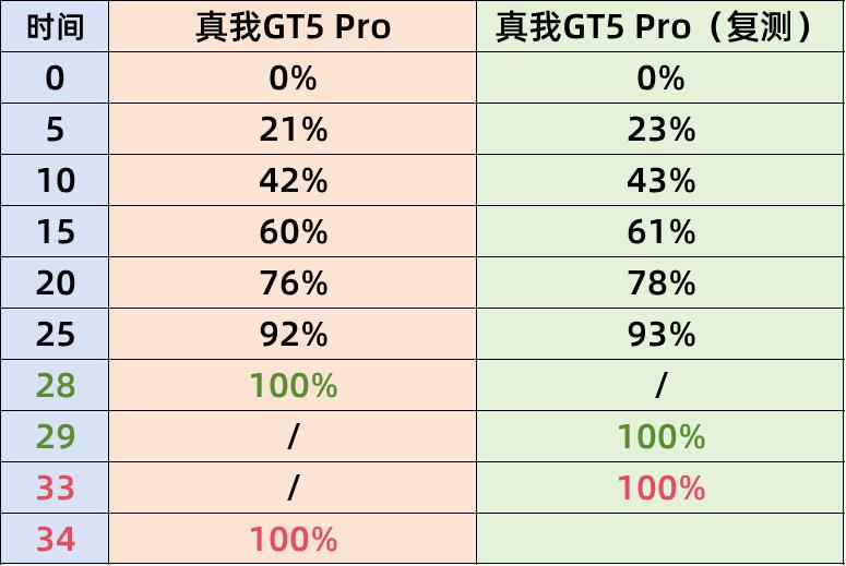 由于真我GT5 Pro发布时间比较久了,我们又对它进行了重测。在新的测试中,第10分钟快了1%,第20分钟快了2%,在完全充满的时间上快了1分钟,整体来看的话,这两次的充电时间非常接近,区别很小。