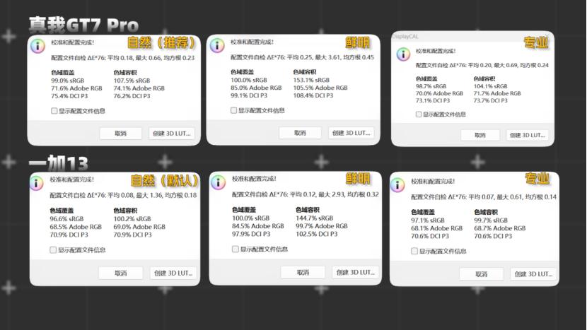 在色彩上,二者均有三种显示模式可选,它们的素质都非常不错,再进一步详细对比数据,GT7 Pro略好一丢丢。