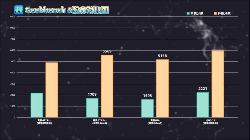 再来看Geekbench,在Geekbench 5的跑分中,单核分数比GT5 Pro高出了28.0%,多核分数高出了17.1%。
