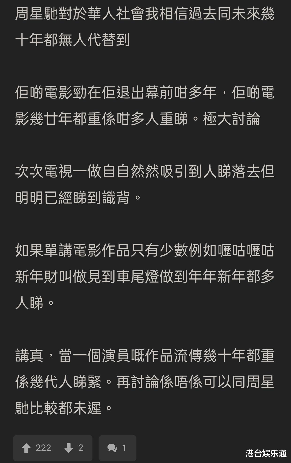 网友D称:“周星驰在华人社会中的地位,我相信在未来几十年内都无人能及。他的电影厉害之处在于,他退出幕前这么多年,电影过了几十年都还有很多人看,有很高的讨论度……讲真,当一个演员的作品流传几十年都在被几代人欣赏,再来讨论是不是可以和周星驰比较也不迟。”