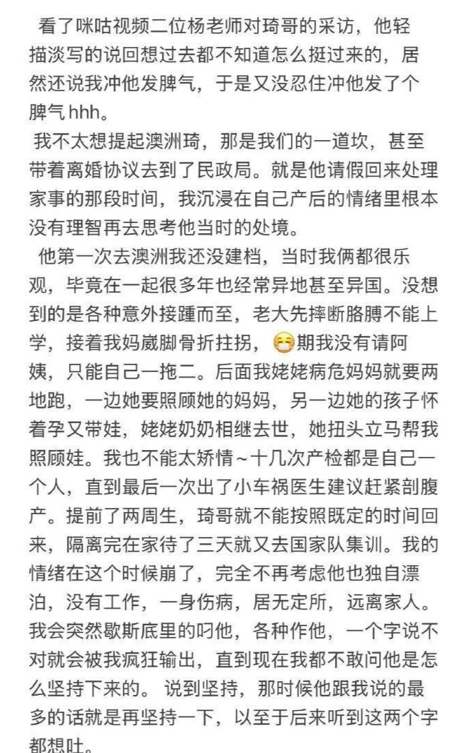 王欣怡表示,2022-2023年周琦在澳洲打球期间,自己独自承担了家庭重担:大女儿摔断胳膊、母亲骨折、姥姥病危、二胎早产等事件接连发生,孕期还遭遇车祸被迫提前剖腹产。长期分居和压力导致她情绪崩溃,曾带着离婚协议到民政局,但事后反思认为这是自己"格局小"的表现,对NBA有执念而怪周琦选择澳洲联赛。