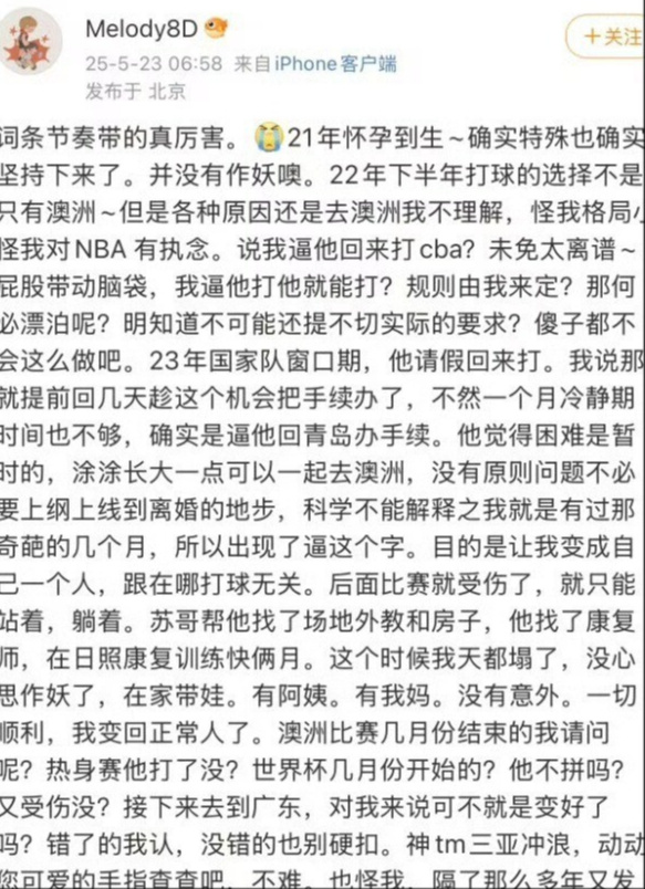 她特别澄清:"说我逼他回来打CBA?未免太离谱~屁股带动脑袋,我逼他打他就能打?规则由我来定?那何必漂泊呢?"并承认当时确实因情绪问题说过"逼"这个字,但目的是想让周琦回国办理手续,而非真正想破坏家庭。