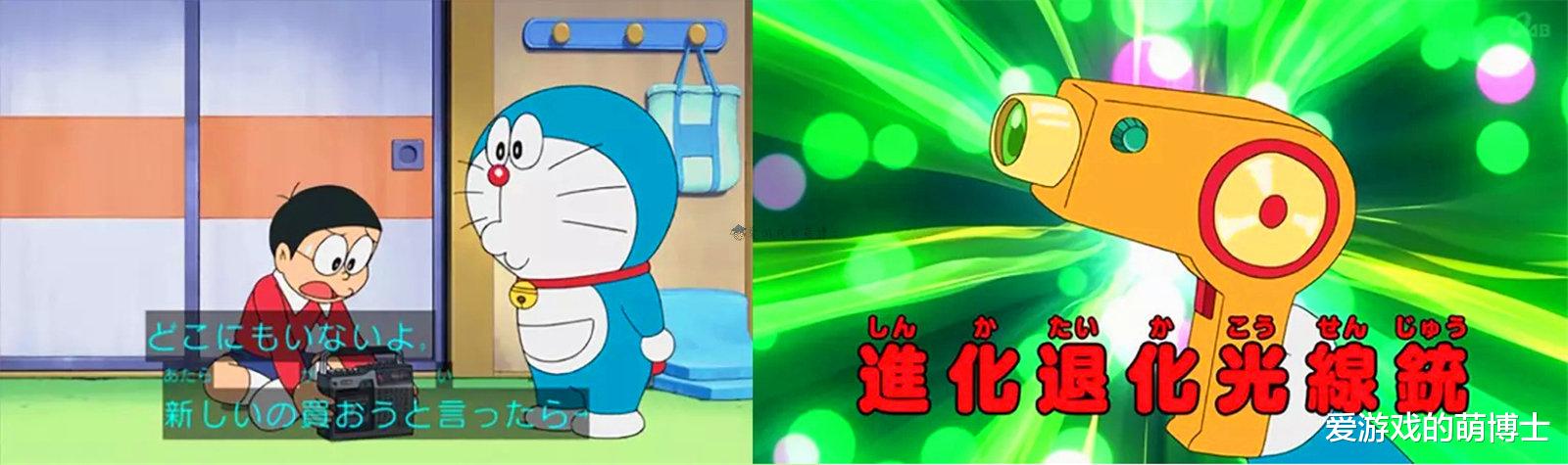 卡式录音机算是上世纪70年代最火的娱乐装置之一(许多摇滚青年扛着这玩意招摇过市),大雄跟哆啦A梦抱怨爸爸不给他买新款,自己的这台都过时了。于是哆啦A梦掏出了所谓的“进化退化光线枪”,顾名思义,这支枪可以让任何东西进化或退化。