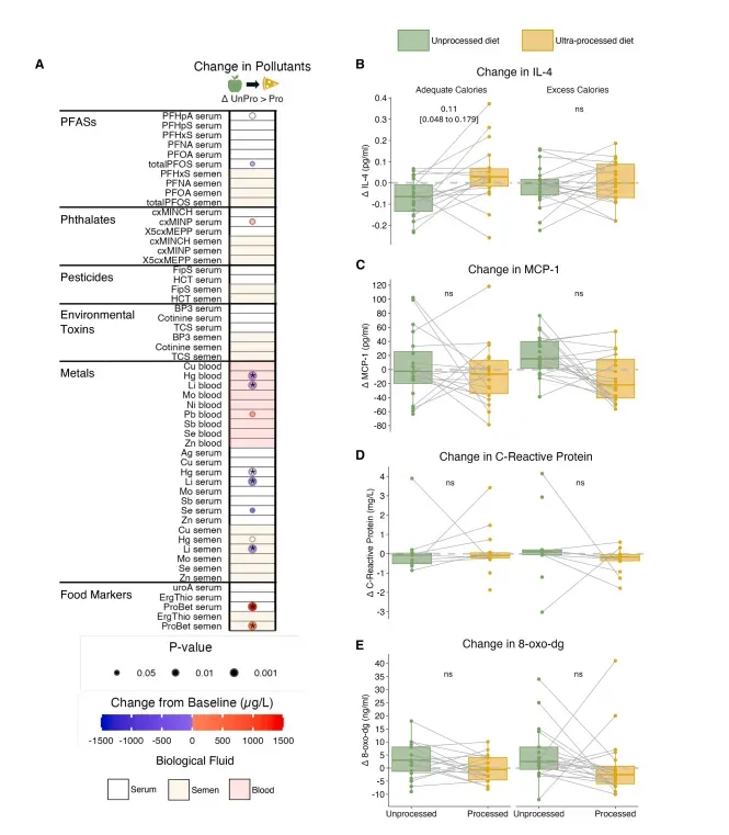 注:a.饮食干预后血清、全血及精液中污染物、金属与食物生物标志物浓度的变化对比(未加工vs超加工);b-d.饮食期间炎症标志物的浓度变化。