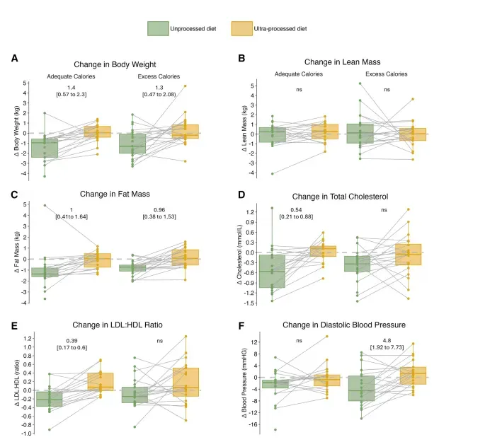 即便总热量与宏量营养素被严格匹配,超加工饮食仍在两条热量臂均诱导0.96–1.00 kg脂肪量增加(95%CI0.38–1.64 kg,P=0.027),体重净升1.3–1.4 kg,而瘦体重无统计学差异,提示能量“沉积”几乎全部发生在脂肪组织。更值得警惕的是血脂谱:在“热量适宜”臂,UPF使总胆固醇上升0.54 mmol/L(95%CI0.21–0.88,P=0.027),LDL:HDL比值增加0.39(95%CI0.17–0.60,P=0.027),而多余热量臂虽数值相似却未达显著(图1),作者据此指出“UPF的脂质扰动在热量平衡状态下反而更突出”,可能与肝脏从头合成胆固醇对快速吸收型碳水更为敏感有关。