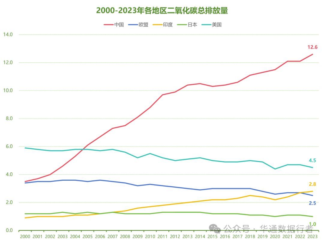 2000-2023年各地区二氧化碳总排放量(单位:十亿吨二氧化碳当量)