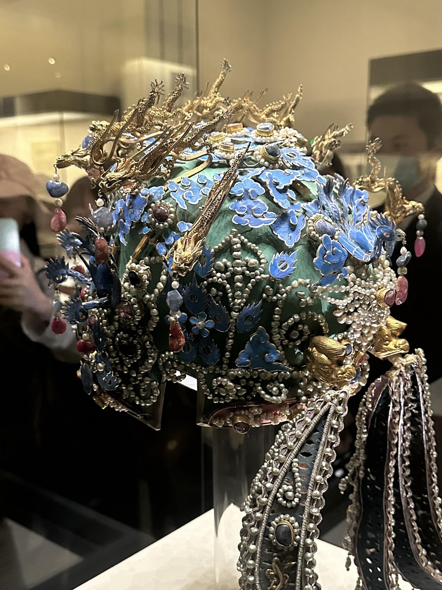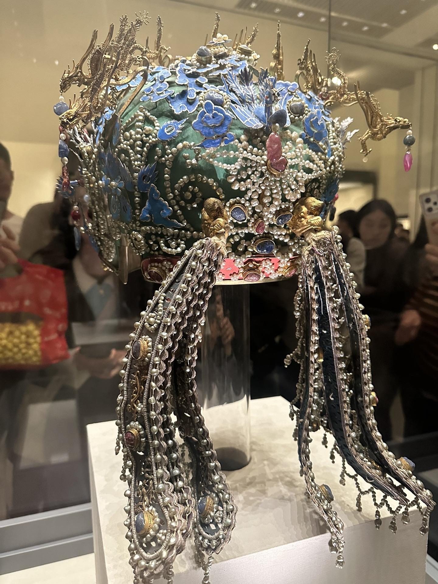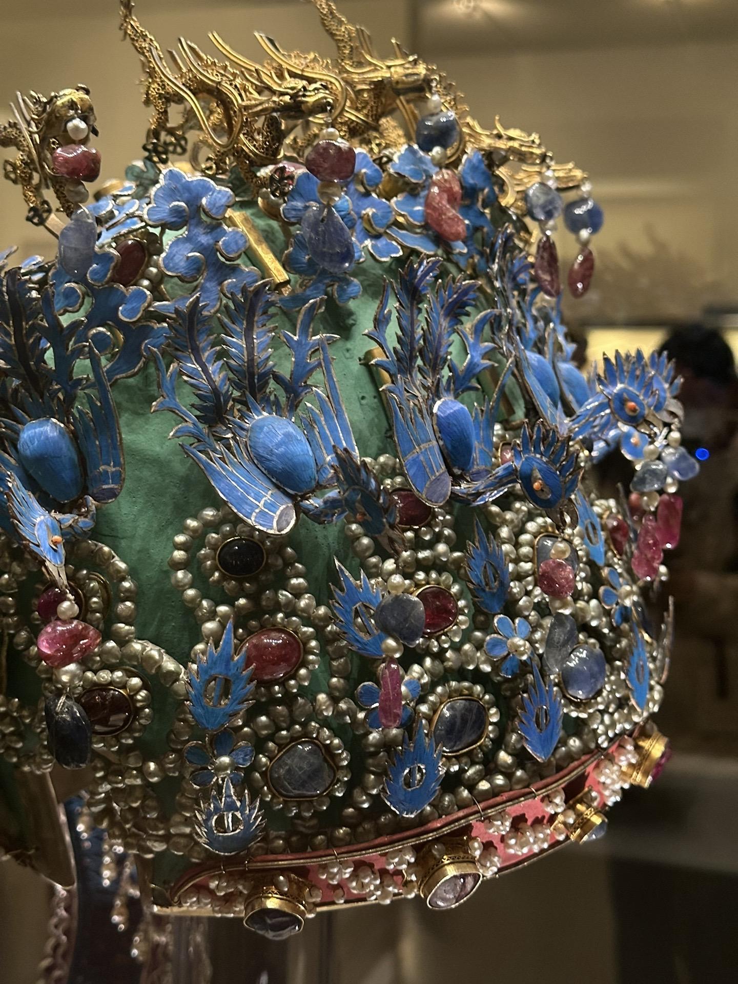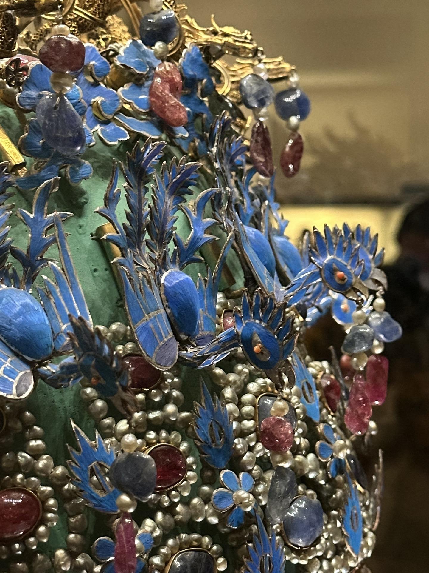 明•孝端皇后九龙九凤冠 该冠通高48.5厘米、冠高27厘米、径23.7厘米,重2320克。用漆竹扎成帽胎,面料以丝帛制成,前部饰有九条金龙,口衔珠滴,下有八只点翠金凤,后部也有一金凤,共九龙九凤。冠上共嵌未经加工的天然红宝石115块,珍珠4414颗。