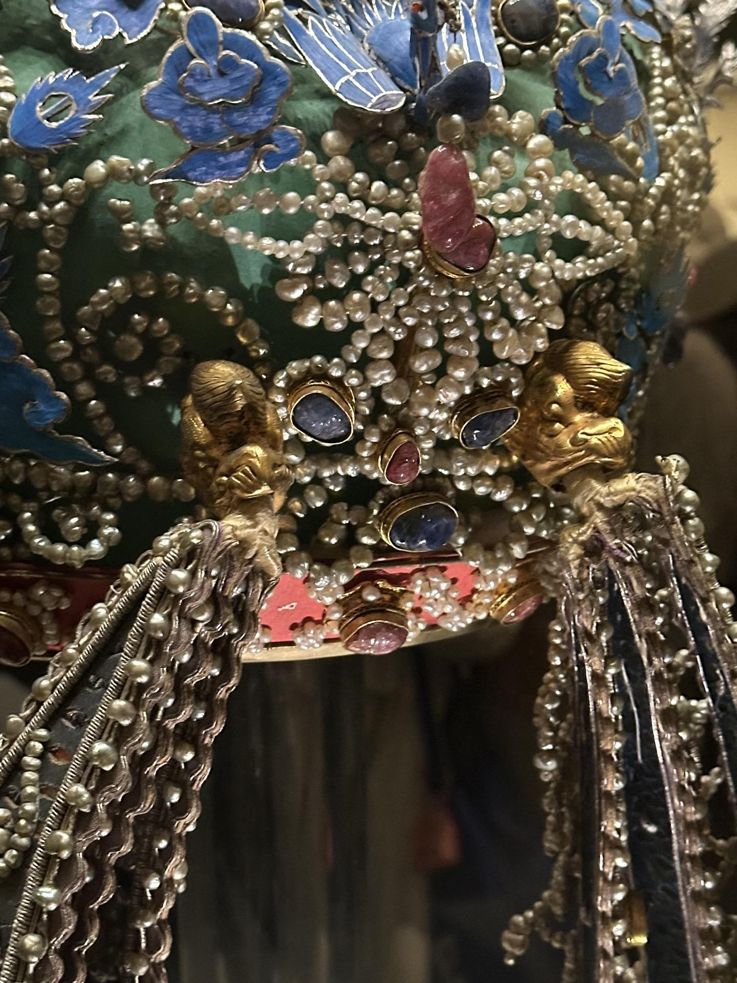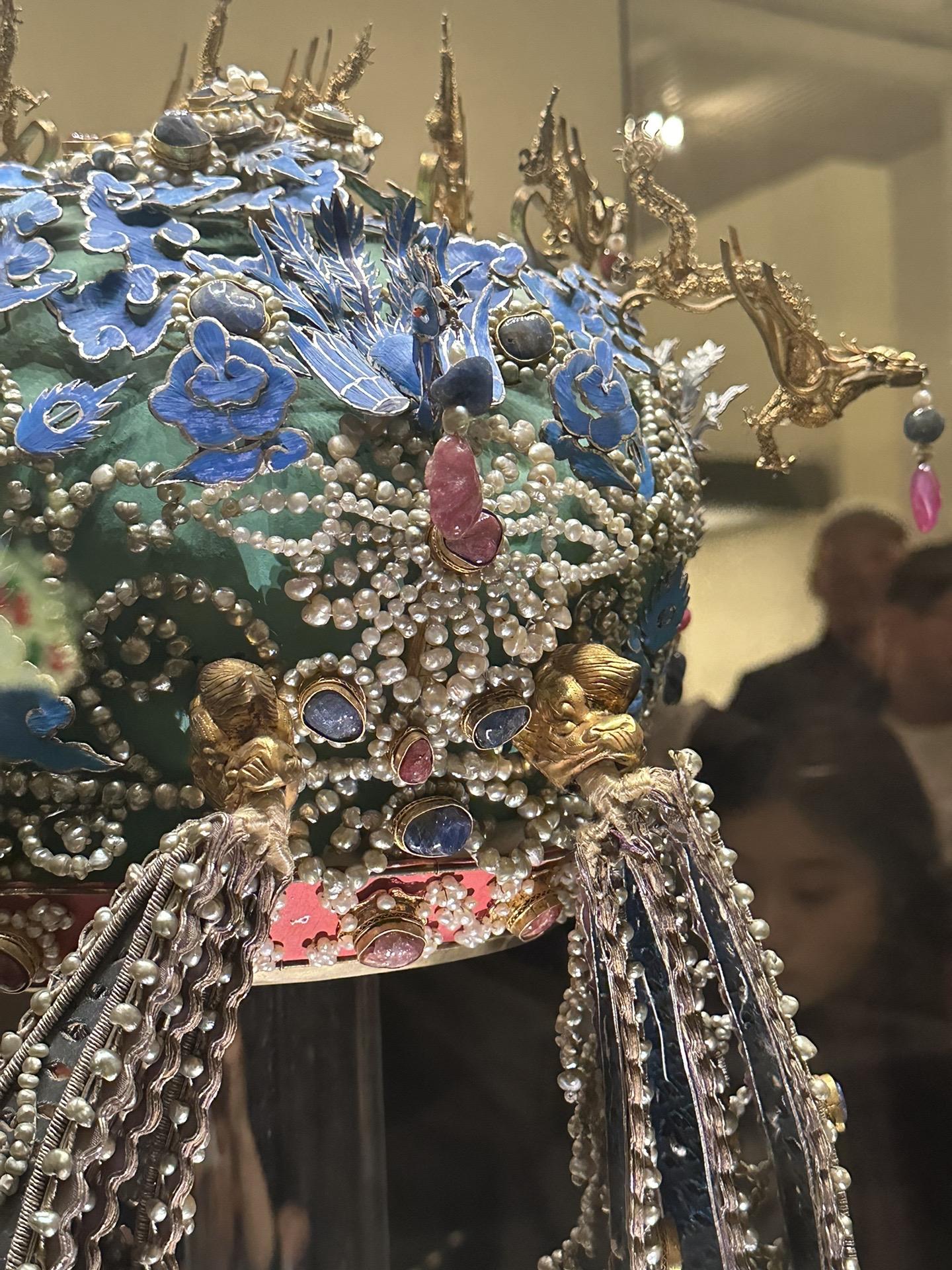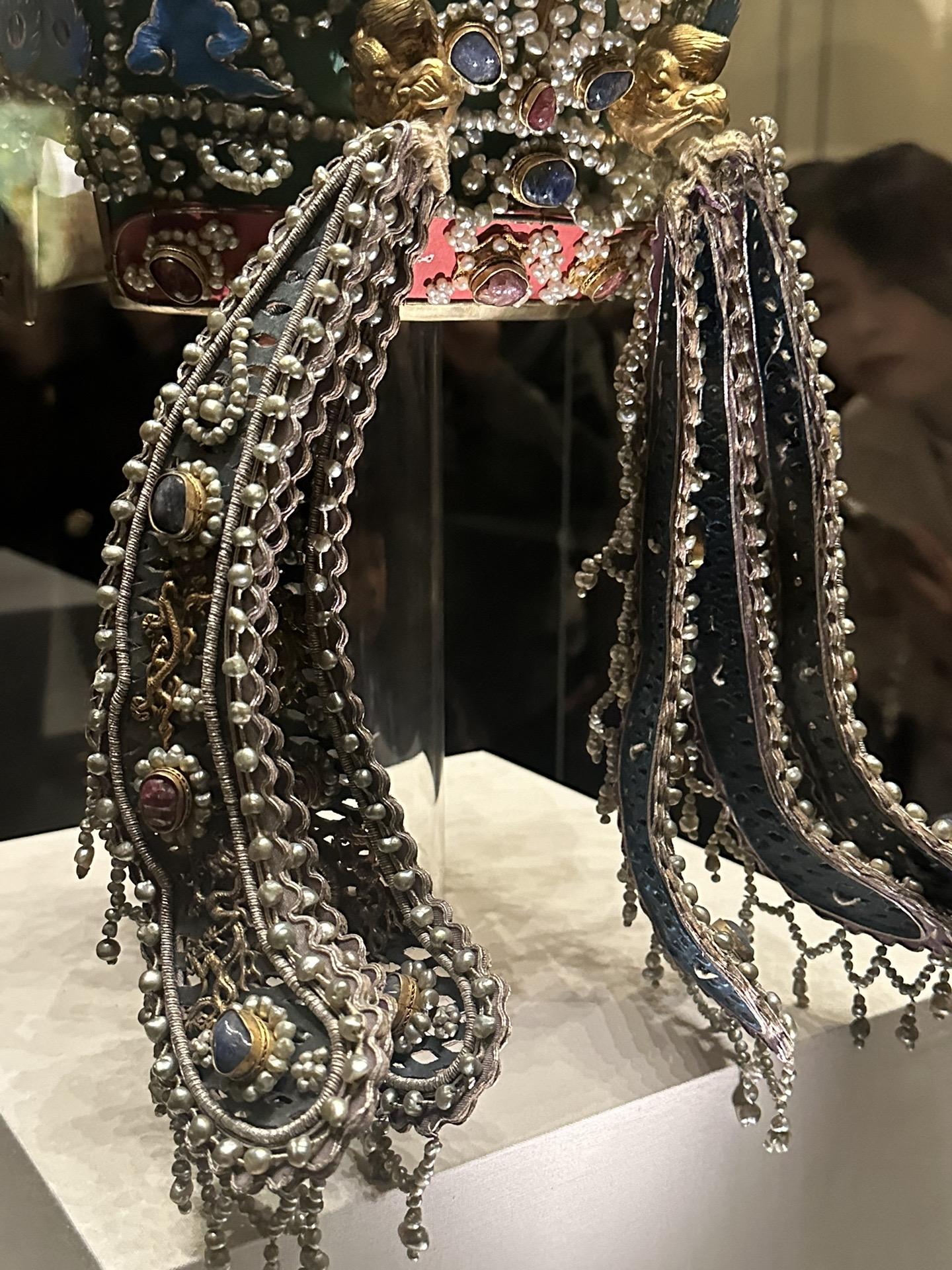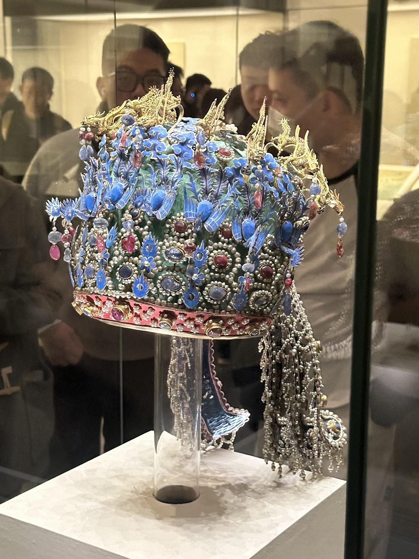 明•孝端皇后九龙九凤冠 该冠通高48.5厘米、冠高27厘米、径23.7厘米,重2320克。用漆竹扎成帽胎,面料以丝帛制成,前部饰有九条金龙,口衔珠滴,下有八只点翠金凤,后部也有一金凤,共九龙九凤。冠上共嵌未经加工的天然红宝石115块,珍珠4414颗。