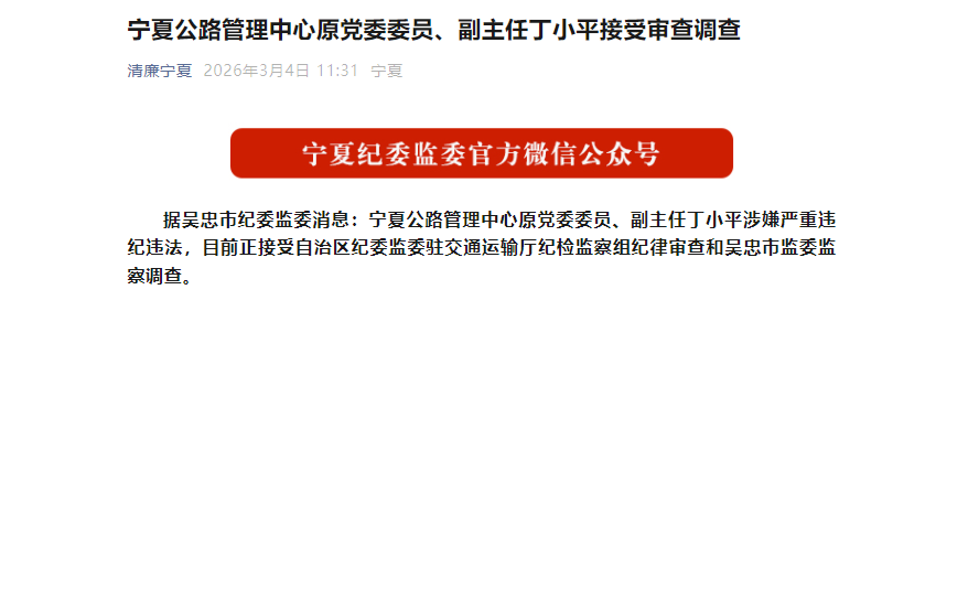 然其人居要津久,渐忘初心。外披技术专家之袍,内怀贪黩营私之念。其所辖公路养护、工程管理,岁耗公帑以亿计。一路之修与不修,一料之购与不购,一标之授与不授,皆在其掌握之间。或于养护资金中虚报工程量,或于材料采购时指定供应商,或于工程验收际高抬贵手,具体罪愆虽待详查,然其以专业壁垒为掩护,行利益输送之实,几可断言。昔日在隧道中攻坚克难之“先锋”,今于权钱交易里堕落成“蛀虫”;昔日手捧奖状之“创新人物”,竟成纪检通报中之“审查对象”。公元二〇二六年三月四日,惊蛰日,宁夏吴忠市纪委监委忽发通报:丁小平涉嫌严重违纪违法,正接受自治区纪委监委驻交通运输厅纪检监察组纪律审查和吴忠市监委监察调查。其时,距其获“科技创新人物奖”未及两载,年方五十,本属壮年,事业如日中天,而竟至此,闻者无不愕然。