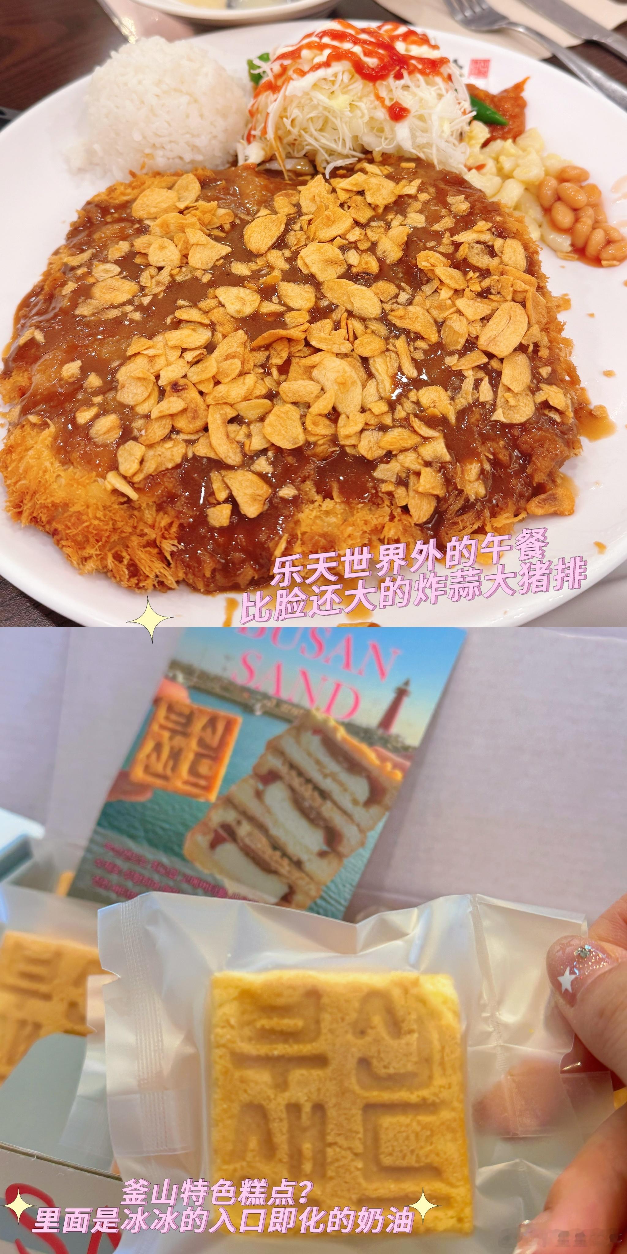 ✔️乐天世界来了,先去纪念品商店,可爱的小东西超级多慢慢挑,戴着头饰去玩项目啦,我是节假日去的,比较火的项目需要排10-20分钟的样子。中午在挨着的美食广场吃了一家韩式炸猪排,我点的这个口味巨巨巨好吃,量很大,上面炸脆的蒜片香爆,推荐两人分一份再点个汤之类的,美食广场的中间有卖糕点的,冰奶油小糕点很值得一试,看着朴实但吃起来绝了,总之这里可以玩一天。