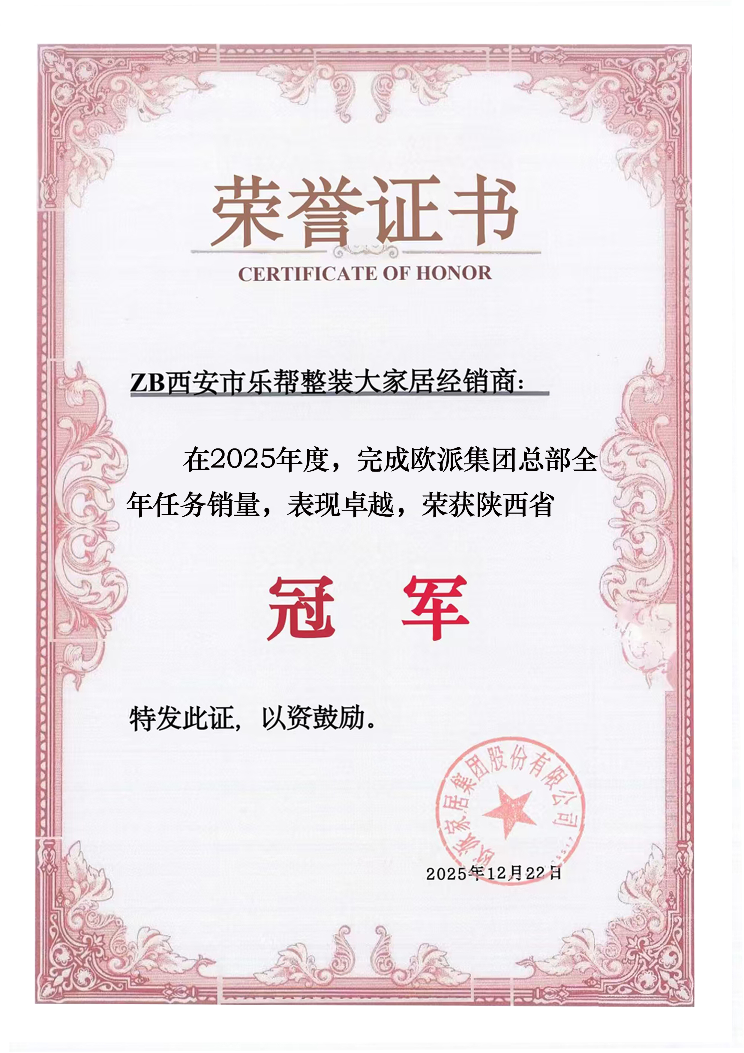 2025年12月22日,西安——在日前圆满落幕的2025年度"陕耀新家 惠动三秦"陕西省欧派整装大家居联动评比中,西安乐帮欧派整装大家居凭借卓越表现,成功蝉联四项核心指标总冠军,再次证明其在整装服务领域的领先地位。