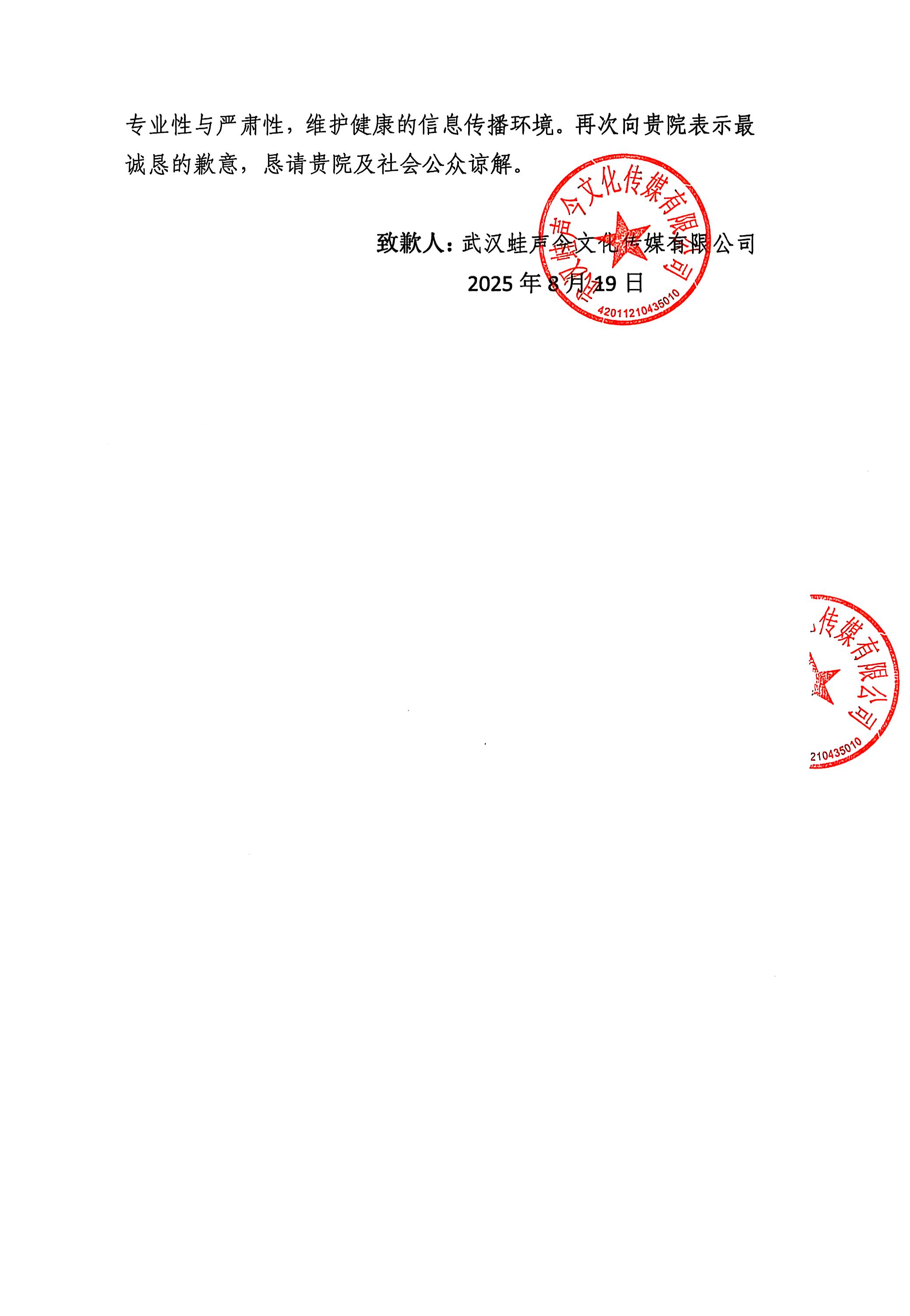 网络并非法外之地,我公司希望以此事件为警示,呼吁广大公众对涉及医疗领域的内容坚持以权威医学资料、客观事实为依据,坚决杜绝盲目传播、不实发声的行为,切实尊重医疗行业的专业性与严肃性,维护健康的信息传播环境。再次向贵院表示最诚恳的歉意,恳请贵院及社会公众谅解。