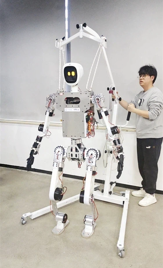 3月9日,记者走进位于天津滨海高新区的天津木牛流马科技发展股份有限公司(以下简称木牛流马)。在企业的研发中心,一台高1.75米的人形机器人骨架已初具雏形。“这个机器人项目去年12月中旬立项,今年5月就能交付。”木牛流马董事长封彦舟指了指旁边的一台小机器人说,“1.3米这款是目前成熟的小尺寸人形机器人产品,主要用于高校实训、展演及赛事。但真正要走进工厂,还得靠这款1.75米的机型。”