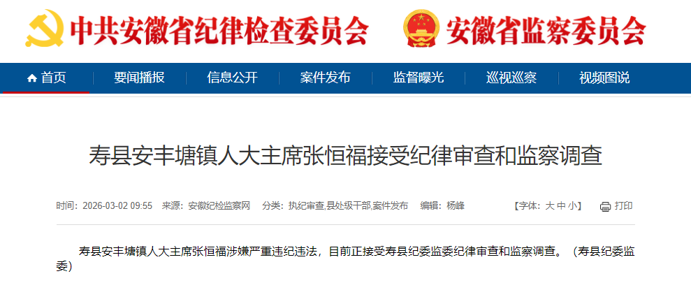 观其宦迹,自乡团委书记至镇人大主席,凡三十七载,未尝离寿县乡土,可谓“老乡镇”,深耕基层。然其久处闾阎,渐忘初心。丙午年(2026)三月二日,寿县纪委监委通报:安丰塘镇人大主席张恒福涉嫌严重违纪违法,接受纪律审查、监察调查。消息既出,乡里愕然。