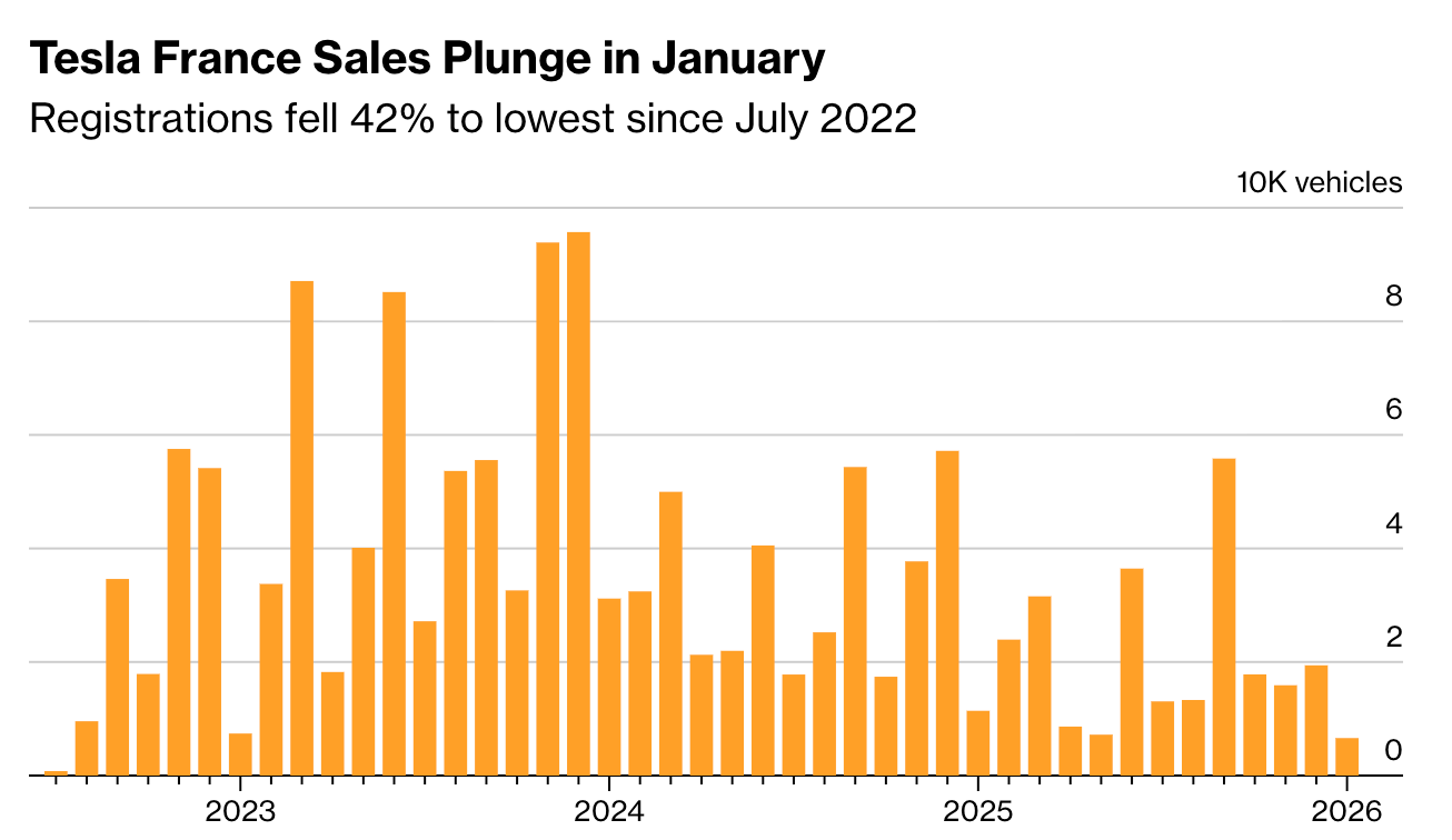 凤凰网科技讯 北京时间2月2日,据彭博社报道,特斯拉在欧洲市场的销量下滑态势延续至新的一年,其注册量在两大主要电动汽车市场出现大跌。