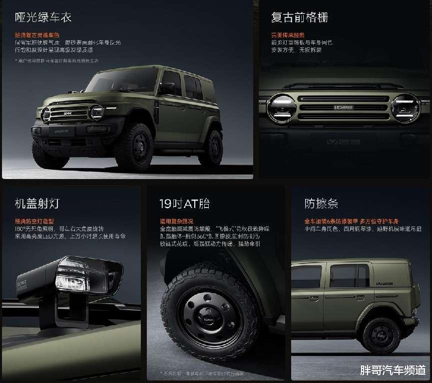 V23方正硬朗的车身轮廓搭配哑光绿车衣,奠定了硬派的基调;复古前格栅在复刻经典造型的同时优化进气设计,提升电机散热效率;机盖射灯严格遵循前大灯规格开发,通过防雾防眩光灯罩强化恶劣天气下的穿透性照明,为越野场景提供可靠保障;车身防擦条选用高韧性材质打造外扩式立体造型,以熏黑工艺提升视觉张力,有效抵御碎石剐蹭与植被摩擦;19吋AT全地形轮胎则通过全宽胎面减震层与强化胎体结构,兼顾复杂路况的抓地力与日常驾驶的舒适性,展现硬核性能与细节美学的平衡。每一项配置都经过严苛的工业验证,确保了改装套件在品质与审美上的双重卓越。