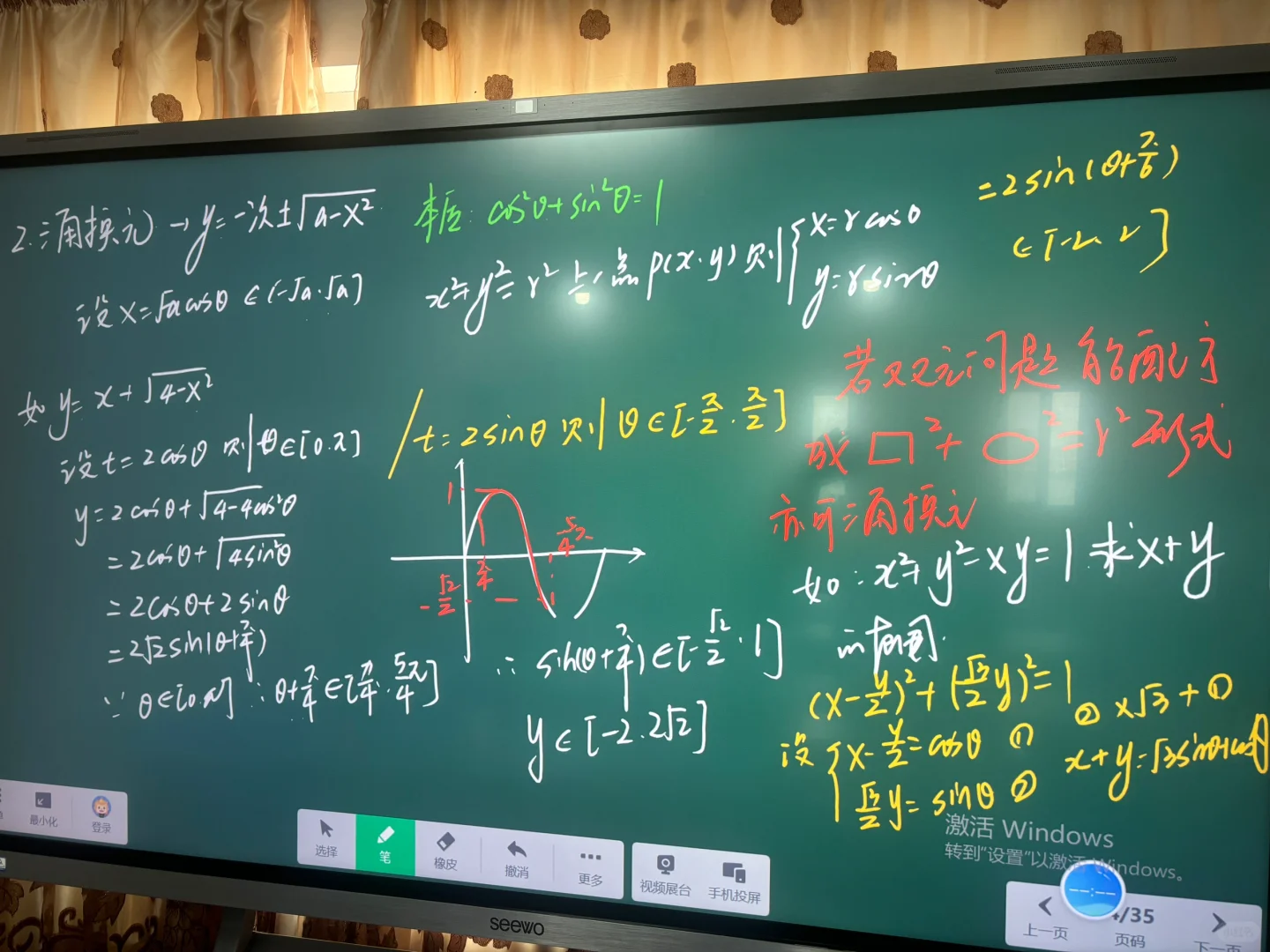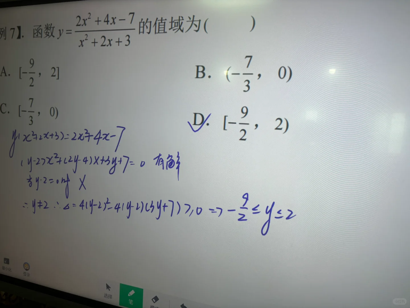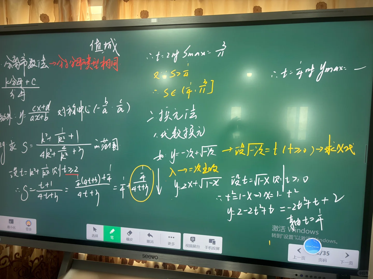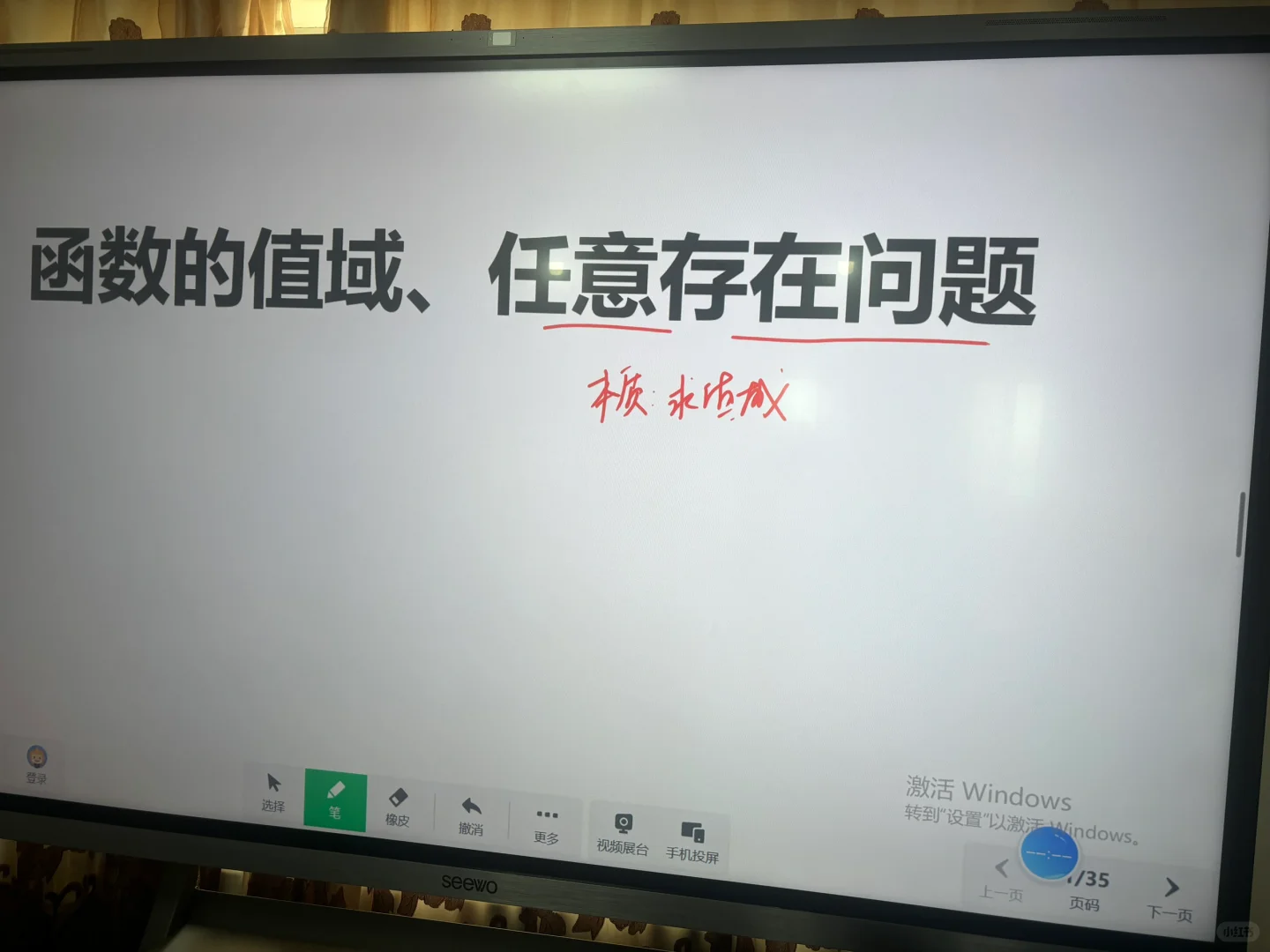 值域是高中数学的一种工具,一般不会直接考察,但是很多题都离不开值域,本讲重点是任意存在问题,在讲这个之前本节课先复习了一下值域问题,但是时间问题还差一点没有复习完,值域的方法很多,但是重点讲了以下几个方法,因为这几个方法比较常见 [耶R][耶R]分离常数法 换元法(代数和三角) 判别式法 图像法(这里补充了平底锅函数) 几何法(没讲完,下节课继续)