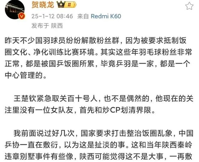 1月11日,中国羽毛球队率先打响整治饭圈文化第一炮。