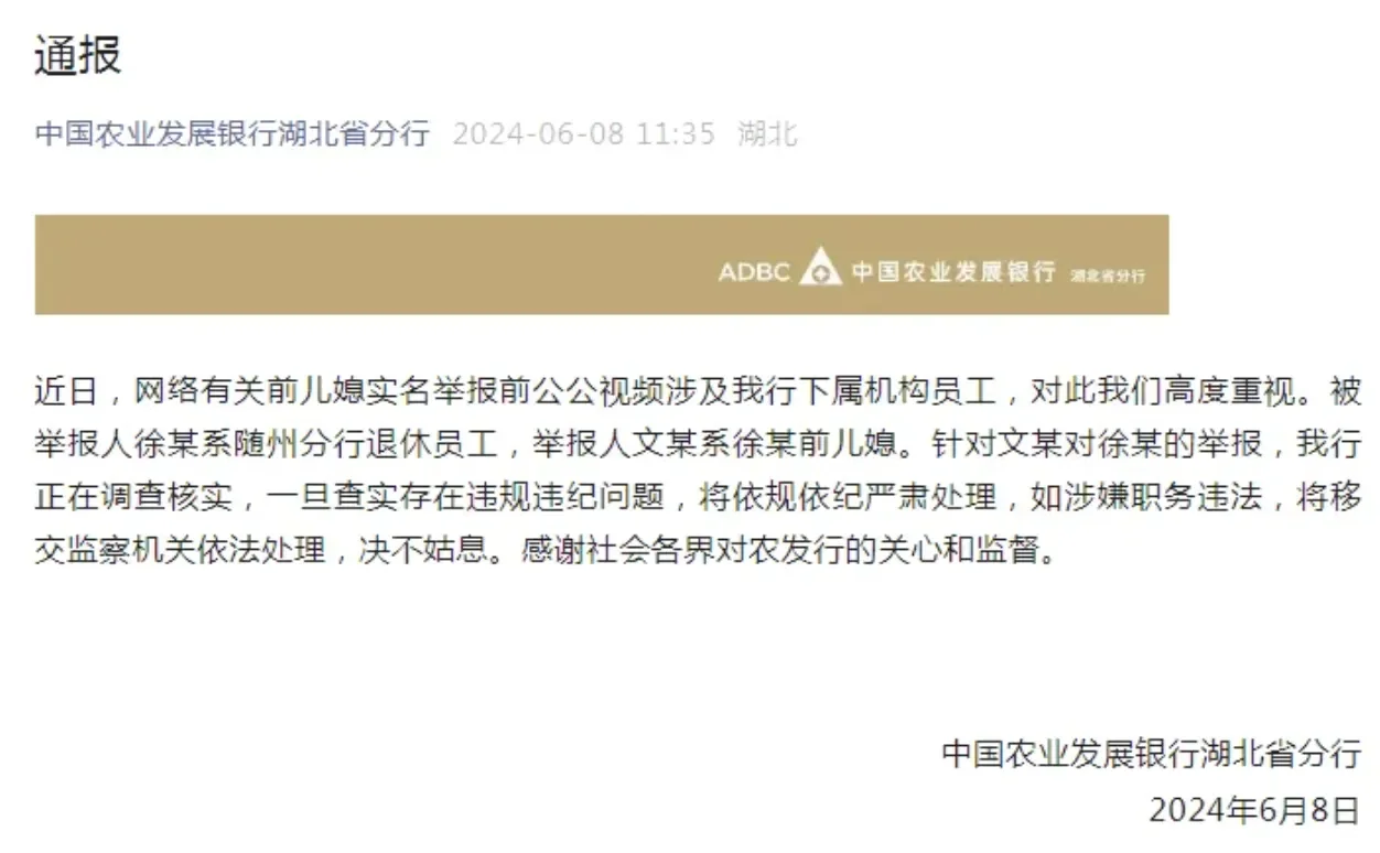 针对文某对徐某的举报,中国农业发展银行湖北省分行正在调查核实,一旦查实存在违规违纪问题,将依规依纪严肃处理,如涉嫌职务违法,将移交监察机关依法处理,决不姑息。