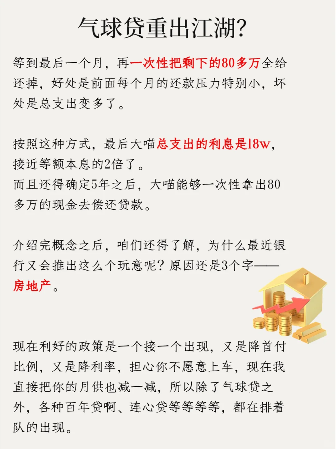先来解释一下,气球贷是一种特色的先小后大还款方式,正常我们比如说借个10年期的贷款,那分成120期,每期固定的偿还一部分的本金和利息。而气球贷则是在前面10年里。每期只还利息和极少的本金,等到期后再一次性把本金还清,就像气球一样。