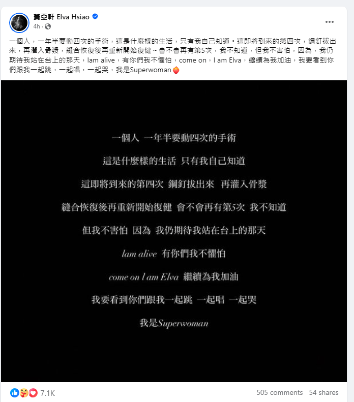 台湾天后萧亚轩(Elva)近日传出不幸消息,45岁生日(8月24日)前夕,她在浴室意外跌伤,导致髋骨关节伤势加剧。她预计将在9月进行第4次手术,这也使她的歌坛回归计划再次延宕。蕭亞軒的粉丝对此感到十分心疼。