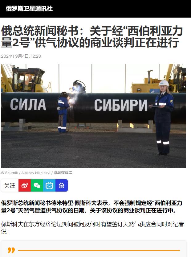 俄罗斯卫星通讯社,2024年9月4日,俄总统新闻秘书:关于经“西伯利亚力量2号”供气协议的商业谈判正在进行