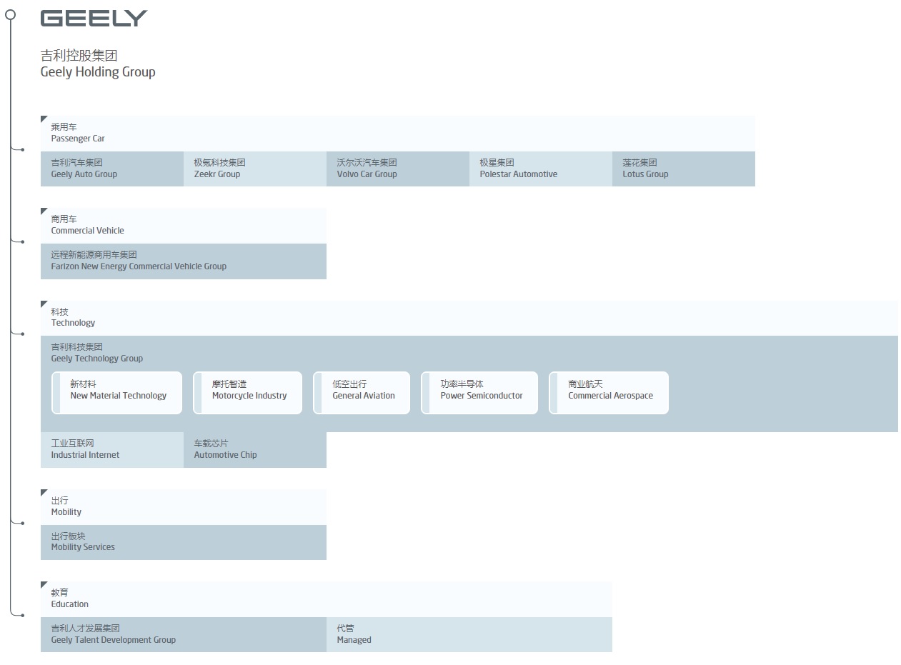 集团业务大板块包括:吉利汽车集团、极氪科技集团、莲花集团、沃尔沃汽车集团、极星集团、吉利科技集团、远程新能源商用车集团、移动出行业务、吉利控股(马来西亚)。