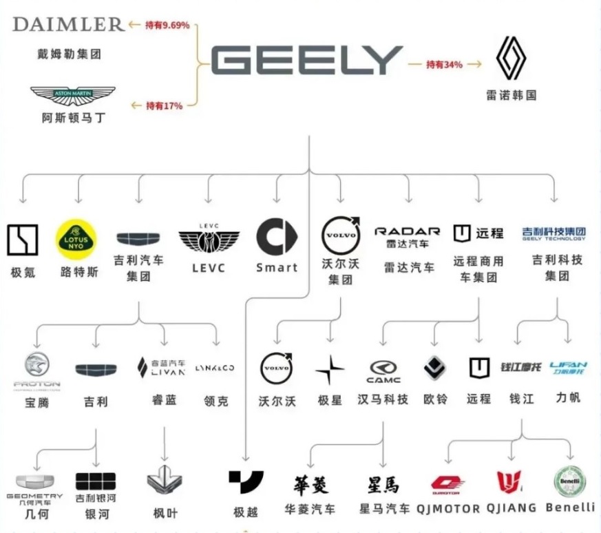 此外,吉利控股集团还持股34.02%雷诺韩国,持股9.69%梅赛德斯-奔驰集团。