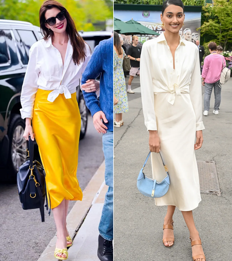 衬衫打结+缎面连衣裙这个穿法,也是拉夫·劳伦近几年的经典公式了。