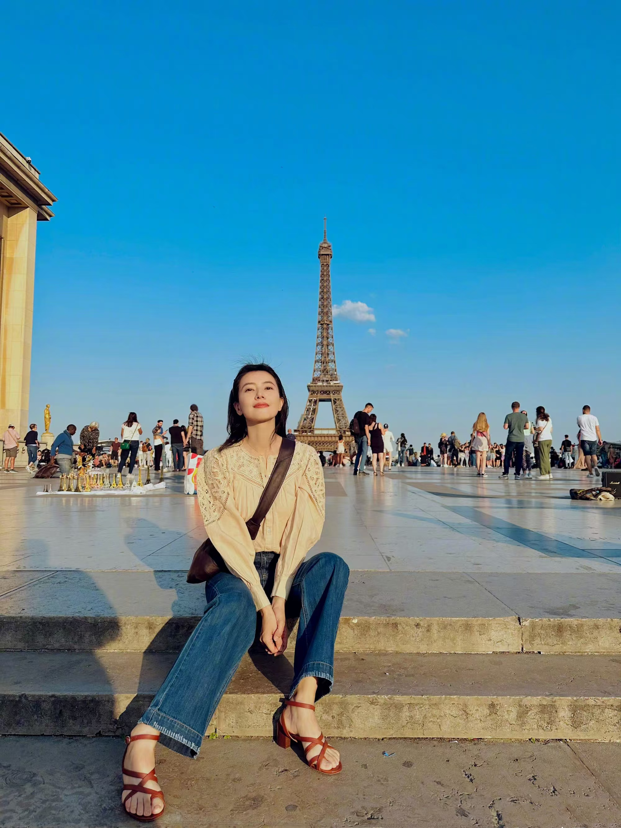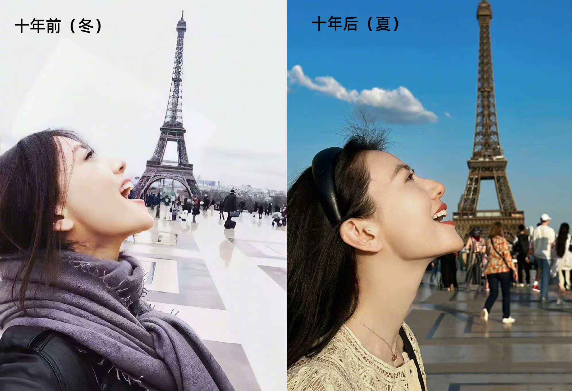 来看一组照片去年6月她在微博发出了十年前和十年后去巴黎的一张对比照片↓,