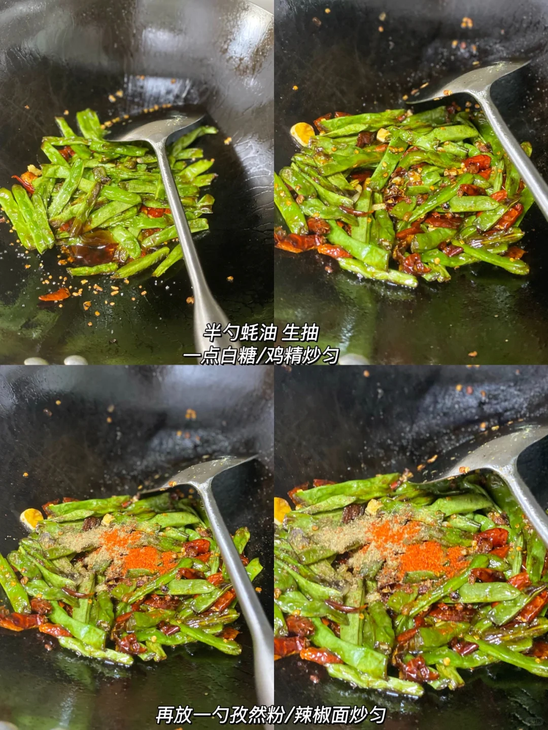 ✨食材:四季豆 干辣椒 花椒 蒜 1⃣️:四季豆撕去两边,掰成段。干辣椒花椒用水泡一会再切,蒜切片备用。锅里多倒点油放四季豆一直煸炒到起虎皮状盛出。 2⃣️:锅里留底油,放干辣椒花椒 蒜片小火炒香,再倒入四季豆 放半勺蚝油/生抽/一点白糖/鸡精大火炒均匀。 炒匀后关火,放一勺孜然粉 辣椒面开火炒。让四季豆裹上调料就可以啦。 [飞吻R]每个人口味咸淡不太一样,起锅前自己尝尝不够再加盐🧂 吃起来真的有种烧烤的感觉[派对R]有点后悔炒少了[色色R] 好好吃饭呀🤘🏻