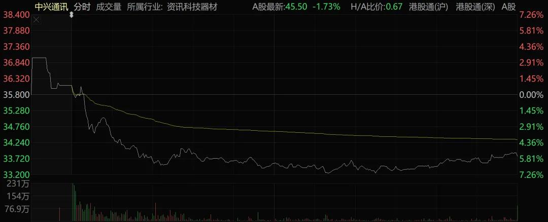 同一天,港股中兴通讯收盘大跌超过5%,盘中更是大跌超过7%。