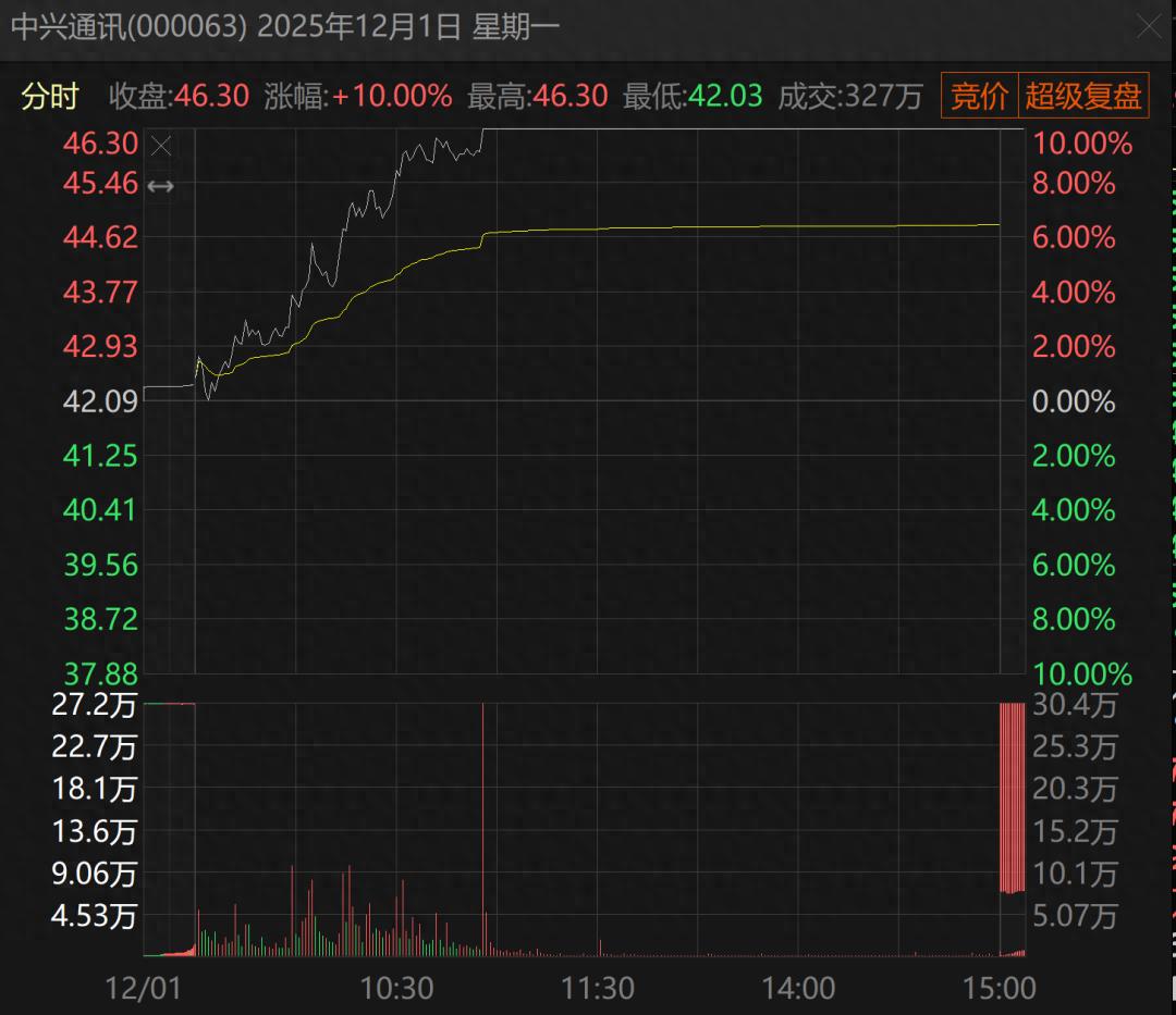 受此消息刺激,12月1日,中兴通讯强势上涨并在上午封死涨停。