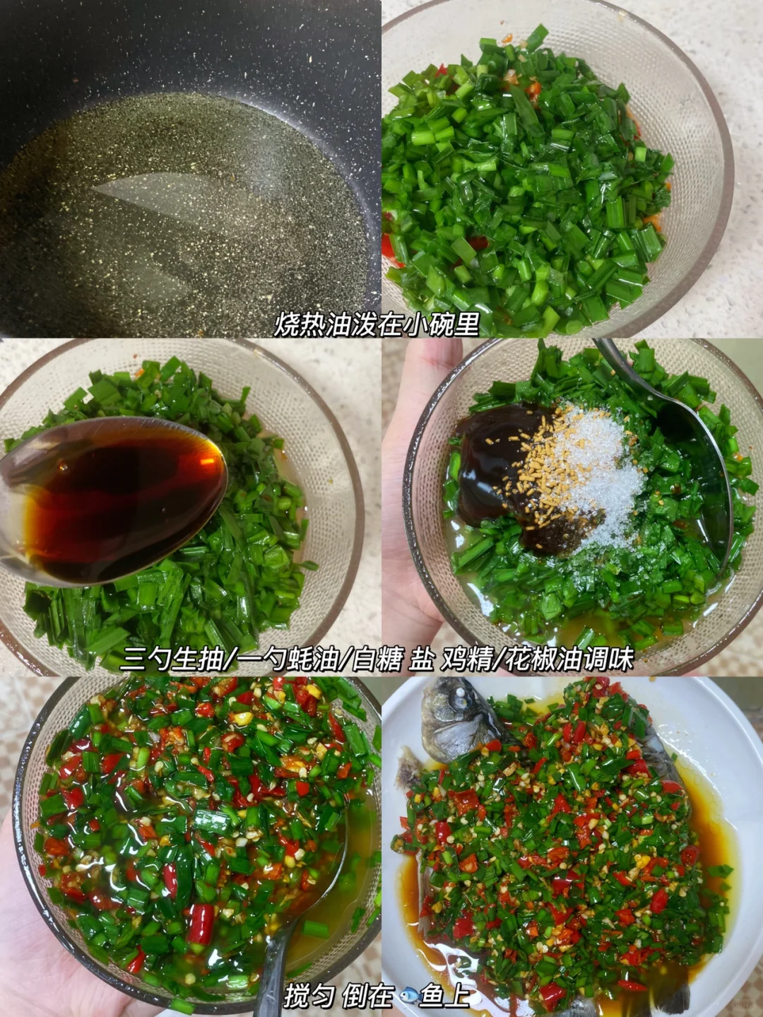 3⃣️:煮鱼的时候准备一下调料,把韭菜碎/姜蒜 小米椒碎放碗里,另外一个锅放油烧热,泼在配料上激发出香味。加三勺生抽/一勺蚝油/花椒油/小半勺白糖/鸡精/盐拌匀。煮好的鱼捞到盘子里,铺上调料就可以啦