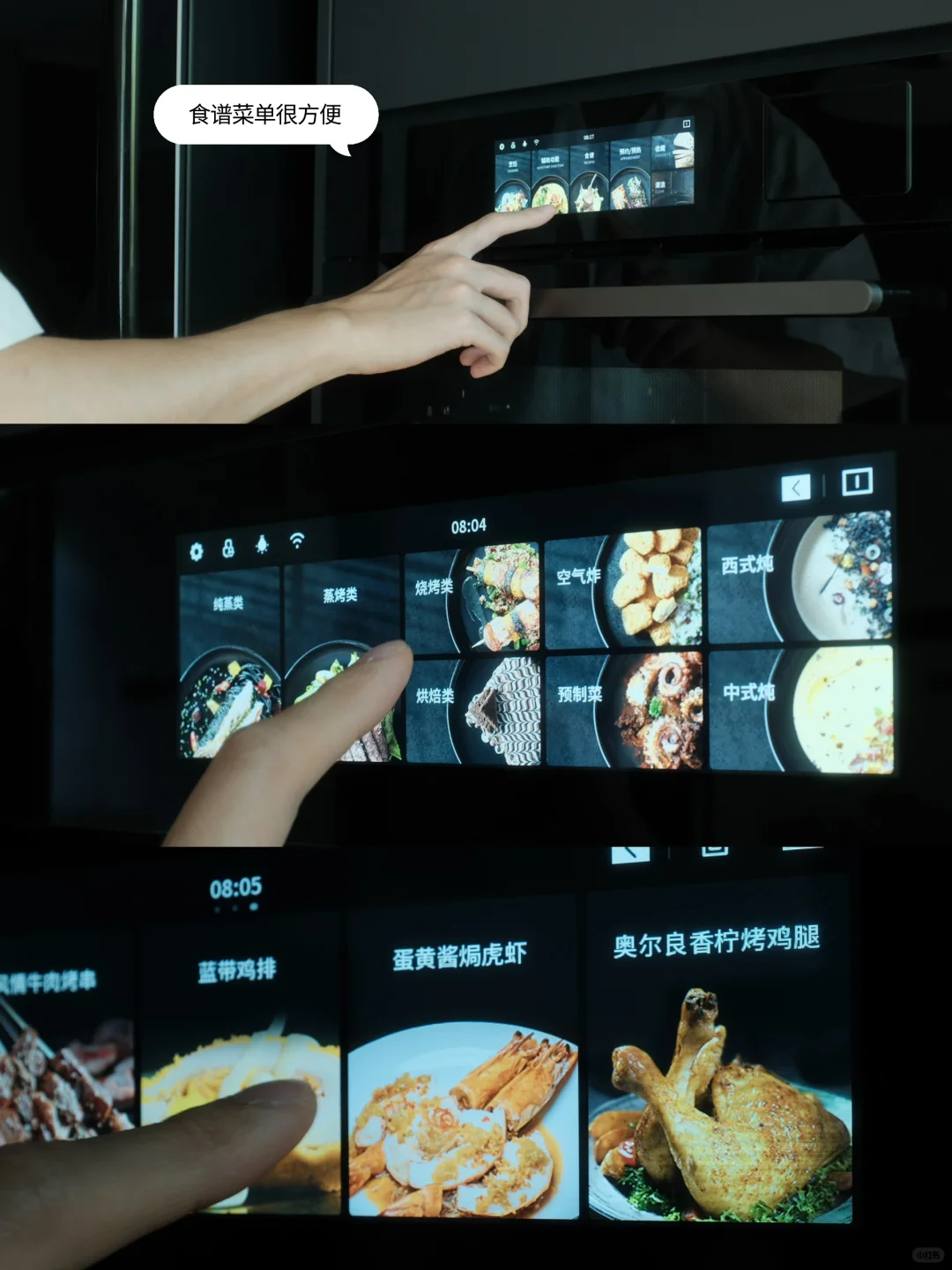 首先,我觉得它真的好适合新手小白。想要做什么菜品,只需在它的智能大彩屏上直接触控点击选择就行。108道菜品,温度和时间都会自动匹配,蒸烤炸炖都okay。还要提一下它们家的【探针料理】功能,对于肉类烹饪真的很友好,能够精准掌控温度,保证鲜嫩。