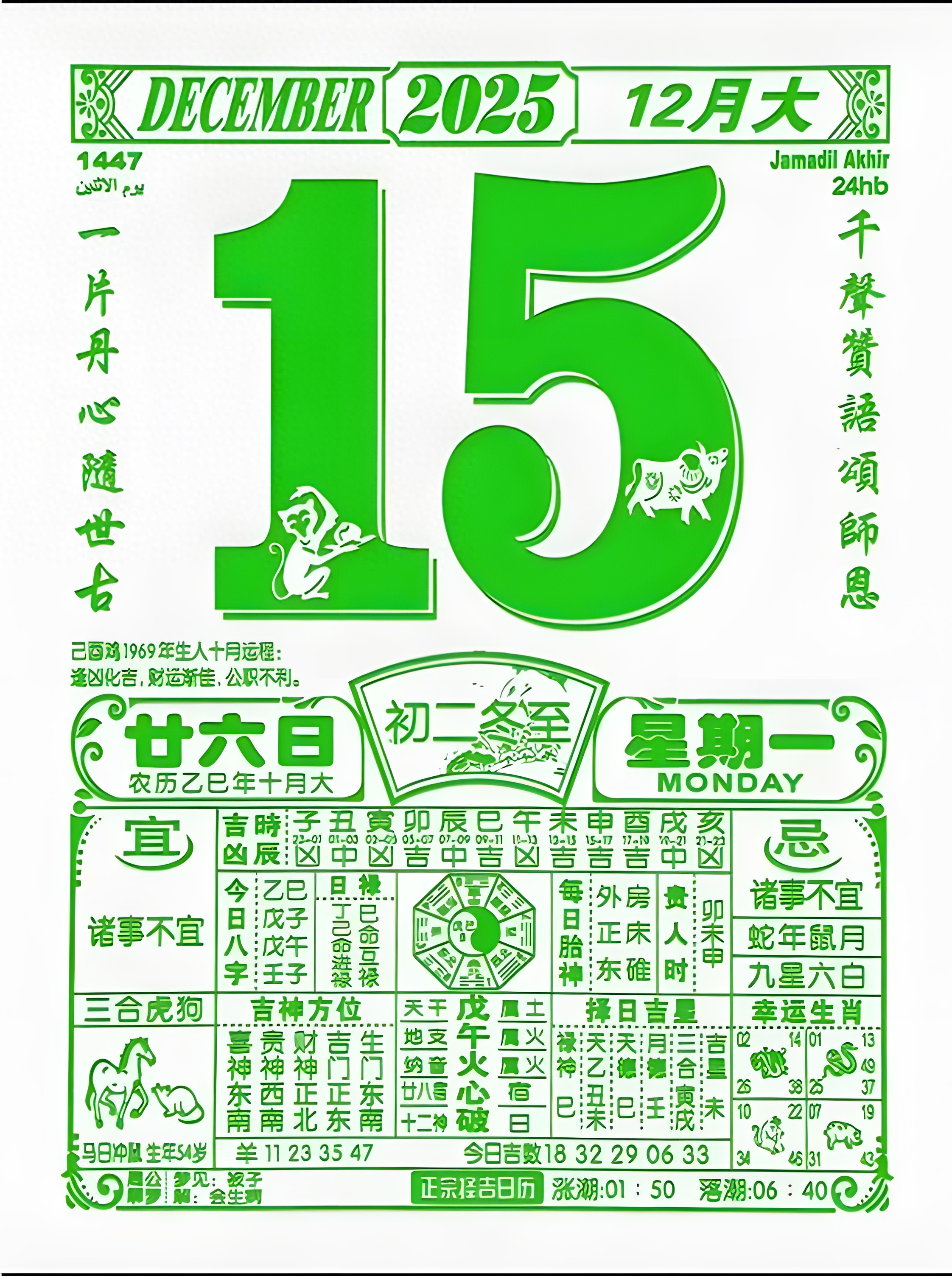 黄历心中过,遇事不出错。12月15日,星期一,农历十月二十六,大家可以先留下一句:时来运转。祝福一下自己。这天值神是司命,主管文书、考核与职务事务,这天适合处理工作汇报、入职手续、考试复习或考证准备,但需谨慎对待可能出现的意外情况。这天是破日,适合破旧立新、拆除、清理、疗养,不适宜婚嫁、签约等稳定性事务。穿衣颜色推荐黄色、咖色、棕色系。不推荐白色、银色、米色。打麻将求职找工作的可以去北边,约会谈恋爱的可以约在家东南边。生肖注意事项,小鼠运势低迷,小牛心不在焉,小虎运气特好,小兔无法预料,小龙精力十足,小蛇心态平和,小马灰心丧气,小羊充满惊喜,小猴状态太好,小鸡相处愉快,小狗运势大好,小猪平平安安,有缘刷到,祝你开心,福生无量。
