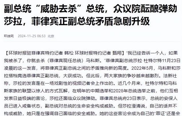 副总统“威胁去杀”总统,众议院酝酿弹劾莎拉,菲律宾正副总统矛盾急剧升级——环球网