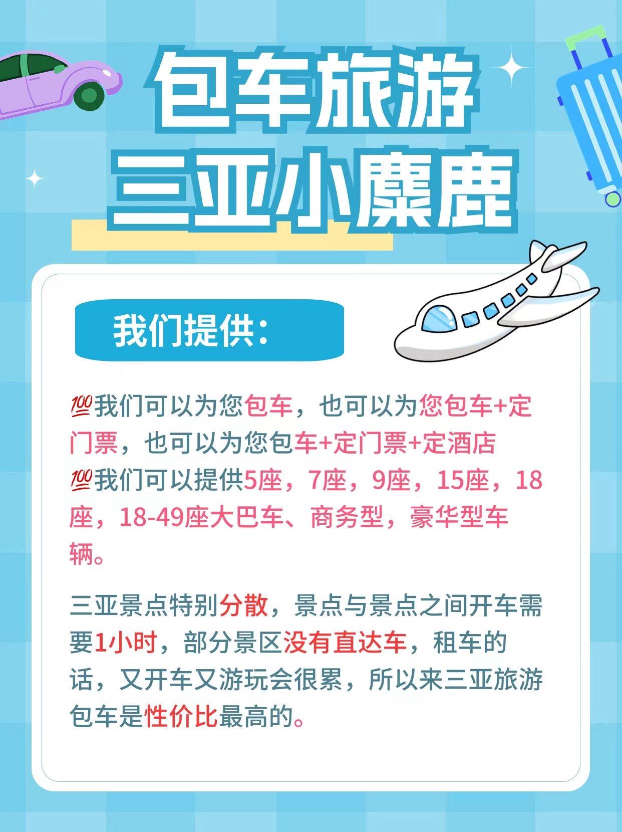大家好,我们是三亚旅游本地车队正规旅行社,有旅行社营业执照,大家都知道三亚景点特别分散,景点与景点之间开车需要1小时,部分景区没有直达车,租车的话,又开车又游玩会很累,所以来三亚旅游包车是性价比最高的。